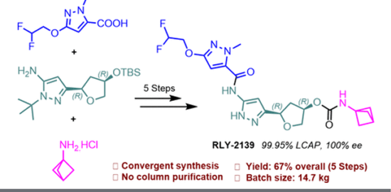 作者:石油醚引言近日,Relay Therapeutics和康龙化等公司科学家合作成功开发出了一条适用于放大生产且低成本的 RLY-2139 合成路线,用于支持临床前及早期临床供应。该路线以中间体 1 和 2 偶联为起点,经脱保…
