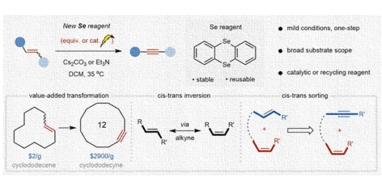 导读:近日,北京大学焦宁教授团队利用硒蒽试剂介导的新策略,成功实现烯烃到炔烃的直接转化。该方法可兼容多种离去基团和敏感官能团,并用于分子的后期编辑。该方法不仅提升了炔烃的可及性,还拓展新转化空间,如通过炔烃中间体实现Z/E构型反转,或在…