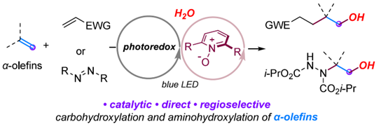 美国Binghamton大学的Mathew J. Vetticatt与Indiana大学的Yongming Deng课题组报道一种全新的光氧化还原/吡啶-N-氧化物催化α-烯烃的区域选择性carbohydroxylation与氨羟化反应。同时,该策略具有广泛的底物范围、良好的官能团兼容性以及广泛的实用性等特点。机理研究表明,反应涉及交织的自由基步骤与极性取代的过程。
