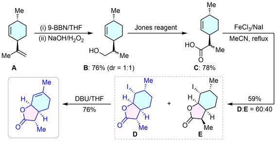 虽然Helmut Guth首次报道了葡萄酒内酯的化学合成,为该分子的结构确认与异构体分离打下了基础,但他的方法只能获得立体异构体的混合物。为了解决这一局限,后续多位学者开展了针对葡萄酒内酯立体选择性合成的研究,以便直接制备与天然产物构型一致且高对映纯度的异构体。其中的代表性工作由Chavan等人在2001年报道,他们的核心步骤是利用FeCl3/NaI介导的碘内酯化反应(Iodolactonization)直接将γ, δ-不饱和酸转化为具有目标相对构型的内酯骨架,随后在碱性条件下消去卤素得到环内双键结构,进而生成高对映纯的目标产物。[4]具体说来,他们以天然的(+)-异柠檬烯A为起始原料,首先对双键进行硼氢化-氧化反应得到等比例混合的非对映异构体B,随后利用Jones试剂将醇转化为羧酸中间体C,接下来利用他们发展的碘内酯化反应高效构建了核心的内酯结构,以59%的产率生成60:40的非对映异构体D和E。幸运的是,两种非对映异构体可以通过普通柱色谱进行分离。最后,在DBU的作用下消去卤素就可以得到与天然葡萄酒内酯立体结构相同的产物。