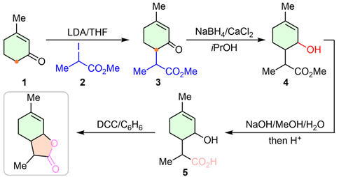 前文已经提到,为了验证葡萄酒内酯的结构并深入理解其立体化学与香气特性,Helmut Guth率先开展了针对葡萄酒内酯的化学合成研究。他以3-甲基-2-环己烯-1-酮(1)作为起始原料,在强碱LDA作用下对其羰基α-位去质子,然后再与2-碘丙酸甲酯(2)发生亲核取代反应,从而构建葡萄酒内酯的核心碳骨架。随后通过NaBH4还原、酯水解与酸化步骤可以获得含有羧基和羟基的环化前体5。最后在缩合剂DCC作用下发生分子内酯化反应,成功合成了葡萄酒内酯的八种立体异构体混合物。[3]该研究首次从化学角度揭示了葡萄酒内酯的立体选择性与香气特性,为其作为关键香气分子的研究提供了坚实证据。