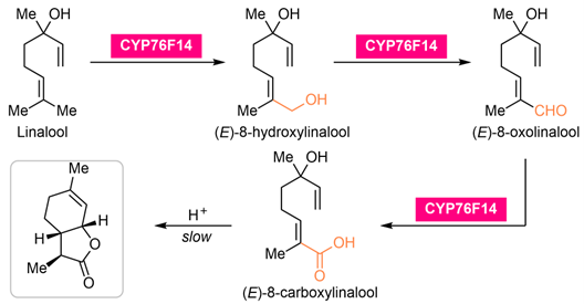 虽然化学家早已通过化学方法在实验室中实现了葡萄酒内酯的合成,然而它在自然界中的生物合成机制研究仍然不够成熟,目前仅有一些重要的假说和初步证据。其中最具代表性的假说由Navrot和Duchêne等人在2017年所提出。[5]他们在葡萄果实中鉴定出一种细胞色素P450酶CYP76F14,它能够将常见的单萜类代谢物芳樟醇(linalool)氧化生成(E)-8-羧基芳樟醇(8-carboxylinalool)。更深入的化学和动力学研究表明,在葡萄酒酿造及陈酿过程中,(E)-8-羧基芳樟醇可在酸性条件下通过非酶促的内酯化环化反应缓慢转化为葡萄酒内酯的主要天然异构体(3S, 3aS, 7aR)。基于上述实验结果,作者提出了葡萄酒内酯可能的生成路径:首先在葡萄果实发育阶段由CYP76F14经多步催化过程逐渐形成前体(E)-8-羧基芳樟醇,随后在酿造与储藏阶段通过化学驱动的酸催化环化步骤缓慢生成最终香气分子。尽管这一路径目前尚未在酶促水平上得到完全验证,但它为解释葡萄酒内酯在自然界中的来源提供了坚实的分子基础,也为理解不同葡萄品种和酒体风味差异提供了新的研究思路。