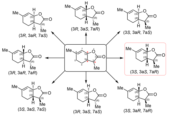 有趣的是,葡萄酒内酯起初并不是从葡萄或葡萄酒中发现的,它最早是在树袋熊(考拉)的尿液中被作为精油代谢产物发现的。[2]数十年后,德国化学家Helmut Guth从葡萄酒中发现了这一香气分子并将其命名为葡萄酒内酯(wine lactone)。不难发现,葡萄酒内酯分子中存在三个手性中心,因此理论上存在23 = 8种立体异构体。为了确定其真实结构,Helmut Guth设计并合成了包含所有异构体的混合物,随后借助手性气相色谱技术将所有异构体逐一分离,进而确定了葡萄酒中普遍存在的嗅觉阈值最低、香气效力最强的异构体是(3S, 3aS, 7aR)。此外,他还发现这些不同异构体在气味阈值(人类能够察觉到气味的最低浓度)上也表现出显著差异,例如(3S, 3aS, 7aR)异构体在空气中的浓度仅为0.00001~0.00004 ng/L时就可以被感知到,而(3R, 3aR, 7aS)和(3R, 3aS, 7aR)异构体则需要在高于1000 ng/L的浓度下才能被感知。[3]