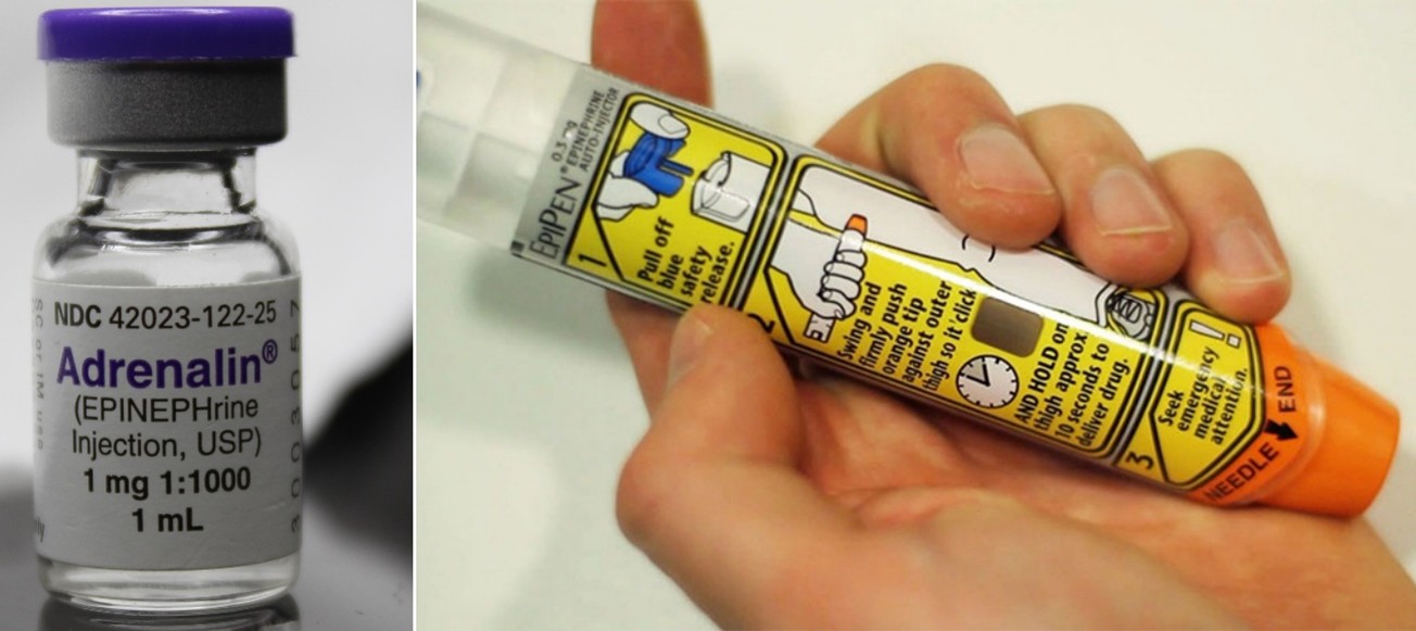 图1 临床使用的肾上腺素注射液(左)及便携式肾上腺素自动注射器(右)
