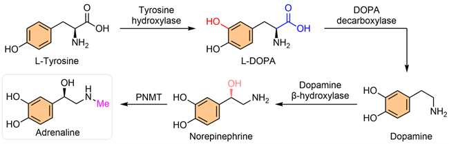 生命体内的肾上腺素大多在肾上腺髓质嗜铬细胞合成,它就像一座微型的“工厂”,以常见的L-酪氨酸为起始原料,经过一系列精准的酶促反应和化学修饰源源不断产生肾上腺素来调节生命活动。首先,在酪氨酸羟化酶(Tyrosine hydroxylase)的作用下,酪氨酸的苯环上引入一个羟基,生成L-多巴(L-DOPA),该步骤通常决定了整个合成过程的效率,即速率决定步骤。随后在多巴脱羧酶(DOPA decarboxylase)催化下L-DOPA脱去羧基生成广为人知的神经递质多巴胺(Dopamine)。紧随其后,在多巴胺β-羟化酶(Dopamine β-hydroxylase)促进下,分子中引入另一个羟基得到去甲肾上腺素(Norepinephrine)。最后,在苯乙醇胺N-甲基转移酶(Phenylethanolamine N-methyltransferase,PNMT)的催化下,去甲肾上腺素的氮原子上引入一个甲基生成最终产物肾上腺素。[2]简而言之,这条清晰的合成路线可以概括为:L-酪氨酸→L-DOPA→多巴胺→去甲肾上腺素→肾上腺素。