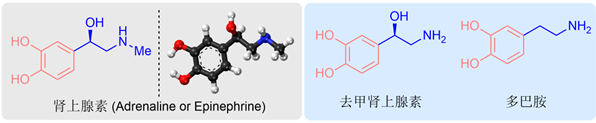 作为儿茶酚胺(catecholamine)家族的成员,肾上腺素的结构并不复杂,它由儿茶酚(邻苯二酚)和侧链氨基组成,因而具有较大的极性和良好的水溶性。值得注意的是,肾上腺素侧链含有一个手性碳原子,和众多生命物质如蛋白质、核酸和多糖在自然界中几乎都是以单一构型存在一样,肾上腺素在生命体内都以L-型存在。