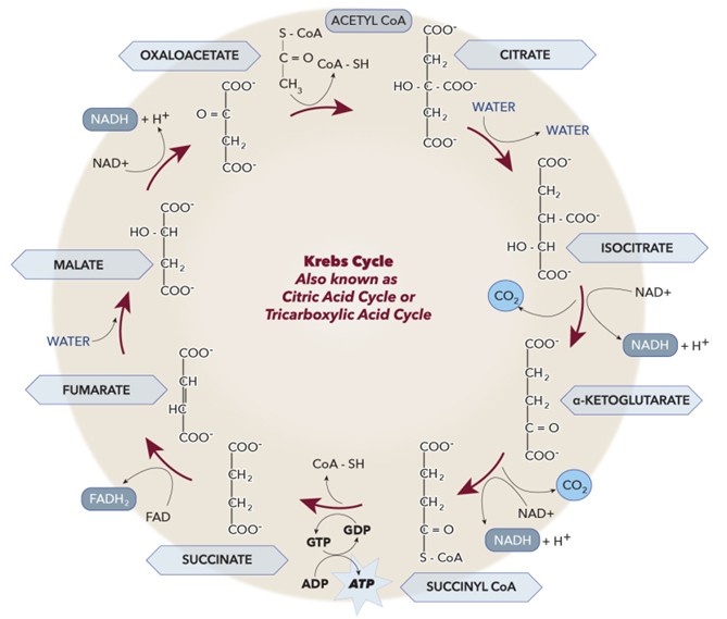 前文已经提到,柠檬酸在生活中有多种用途,但它在生物化学中最重要的功能之一莫过于柠檬酸循环(Citric Acid Cycle,又称三羧酸循环)。该循环过程由英国生物化学家Hans Adolf Krebs发现,他也凭借这项重大发现荣获1953年诺贝尔生理学或医学奖,因此柠檬酸循环又常被称作克雷布斯循环(Krebs cycle)。它是细胞呼吸的核心步骤,发生在真核细胞的线粒体基质中。柠檬酸循环的过程十分复杂,其中循环的起点正是柠檬酸,即乙酰辅酶A与草酰乙酸(oxaloacetate)缩合生成柠檬酸,从而开启整个代谢通路。在随后的系列反应中,柠檬酸经过多步转化逐渐释放出CO2并将柠檬酸中的化学能转化至还原辅酶,例如NADH和FADH2中。随后,这些分子会进入电子传递链,为细胞合成大量ATP提供能量。[4]换言之,柠檬酸在这里不仅仅是一个中间产物,它还是“开关分子”,标志着代谢物进入了高效的能量转换通路。