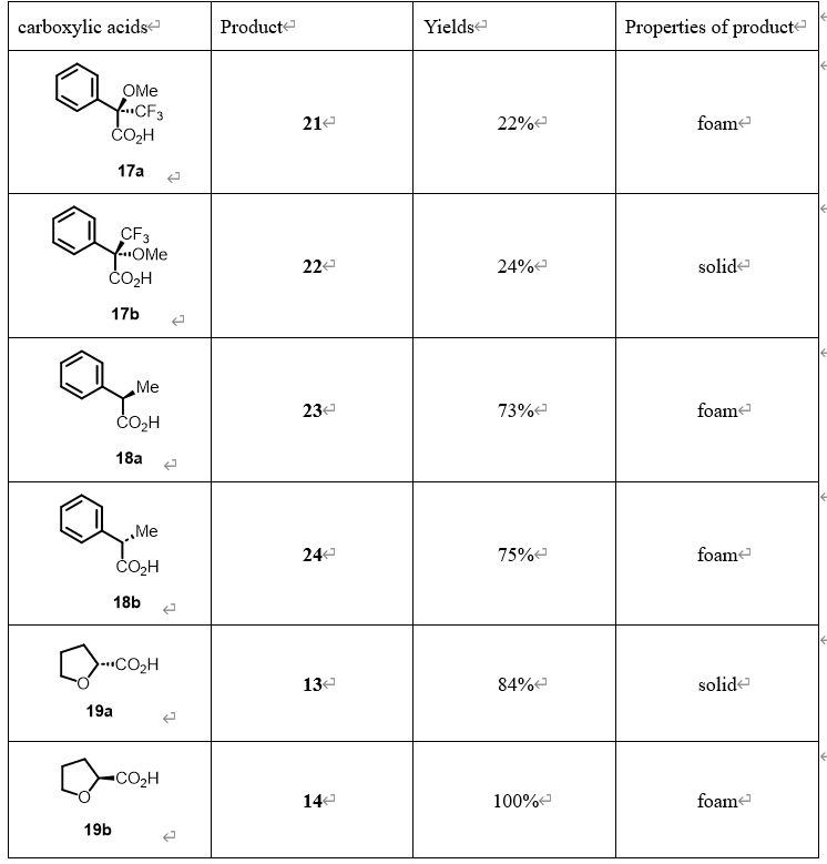 首先,通过R–12与多种手性羧酸缩合(图3),考察是否可选择性析出所需非对映异构体固体。结果表明:1)R–12与羧酸17a和17b缩合产率较低;2)R–12与18a,18b,19a,19b的缩合产率较高,仅有产物 22 和 13 为固体化合物;3)以19a作为手性拆分剂,S–12与 19a 的缩合产物 25 为非晶态 14 的对映体,而 R–12与 19a 的缩合产物 14则为固体。进一步表明消旋体 12与 19a 缩合会生成可通过结晶分离的非对映体。