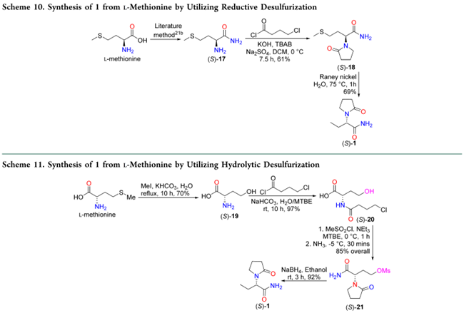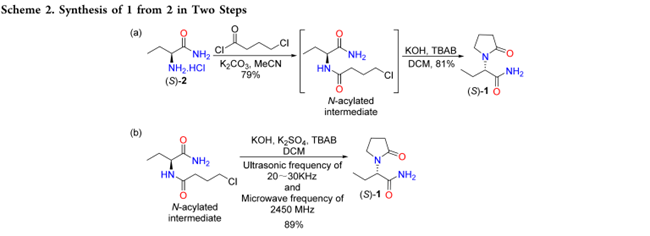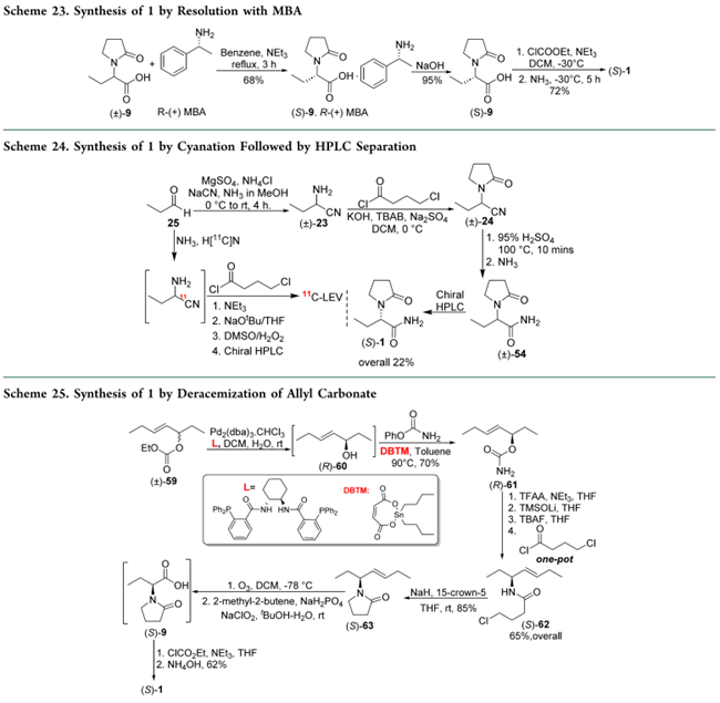 (±)-2-(2-Oxopyrrolidin-1-yl)butyric Acid((±)-9)在苯中、三乙胺存在下,与(R)-(+)-α-甲基苄胺(R-(+)-MBA)成盐拆分,析出(S)-9的R-MBA盐;碱处理后酸化得(S)-9;再经氯甲酸乙酯活化、氨解即得1(Scheme 23)。Neelakandan等改用甲苯/石油醚或THF替代苯,提升过程绿色性。