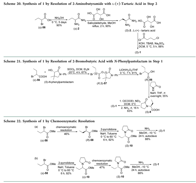 Boschi等人报道通过用(S)-N-苯基戊内酰胺作为手性辅助剂处理(±)-56 实现其消旋体拆分。其中(R,S)-57 是主要成分(67%,>98:2 dr),通过硅胶柱层析将其分离。使用 LiOH/H2O2 在 THF 中进行水解消除手性辅助剂,得到(R)-2-溴丁酸((R)-57)。在 THF 中以 NaH 为碱,用 2-吡咯烷酮对化合物 (R)-57 中的溴原子进行 SN2 取代,得到酸 (S)-9,其与氯甲酸乙酯和氨水反应,以 63% 的产率和>99% ee转化为 1。值得一提的是,用 N-苯基戊内酰胺拆分(±)-2-(2-氧代吡咯烷-丁酸和(±)-2-氯丁酸,在非对映异构体比方面结果不尽人意(Scheme 21)