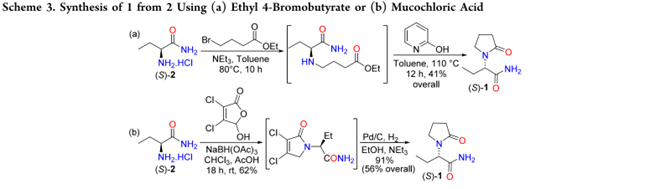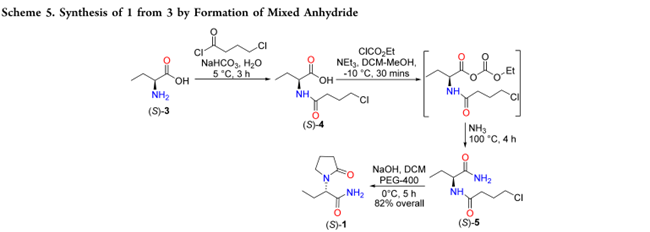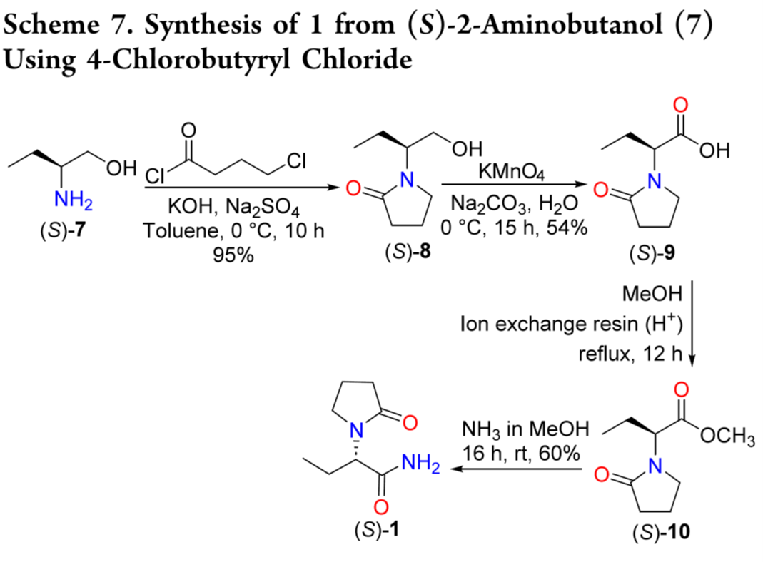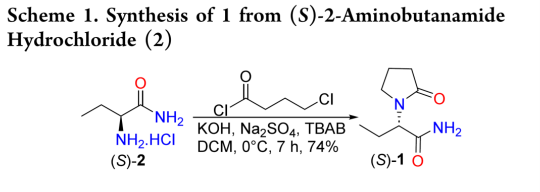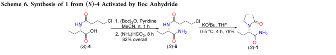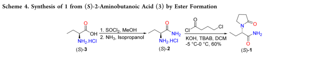(S)-2-Aminobutanoic Acid (3)作为原料。酸转化为酰胺可通过酯化、混合酸酐法或 Boc酸酐活化后氨解实现。Acharyulu等人以3原料经酯化和氨解生成 2,随后在氢氧化钾存在下与 4-氯丁酰氯反应得到 1 (60 %)(Scheme 4)。该方法的主要缺点是产率低,并产生有害酸性废液。