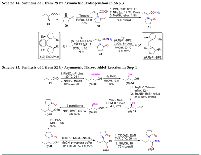2-氧代丁酸(28)与2-吡咯烷酮(29)缩合得化合物30,再经酰氯化/胺化两步转化为脱氢左乙拉西坦(31)(Scheme 14)。化合物31通过不对称氢化制得目标物1: