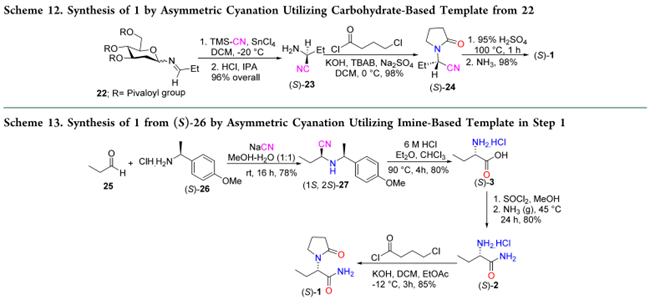 Zhang采用N-(3,4,6-三-O-叔丁氧基-2-脱氧葡萄糖基)丙基亚胺(22)作为手性模板,实现高选择性氰化,再经水解脱除辅助基团得(S)-23;随后与4-氯丁酰氯环化得(S)-24,再经95% H₂SO₄水解及酰胺化,获得目标产物1(92% yield)(Scheme 12)。但该路线因使用剧毒氰化物及强腐蚀性SnCl₄(用于亚胺活化),存在安全与设备兼容性风险,难以工业化放大。 Raju等改用Strecker反应:丙醛(25)与手性胺(S)-26缩合生成亚胺,CN⁻从位阻较小的re面进攻,立体选择性得到(1S, 2S)-27;水解得酸3,经SOCl₂/MeOH酯化、氨解得酰胺2,再与4-氯丁酰氯在碱性条件下环化得1(Scheme 13)。尽管步骤清晰,但因依赖NaCN且总收率仅42%,综合安全性与经济性,仍不适用于大规模生产。