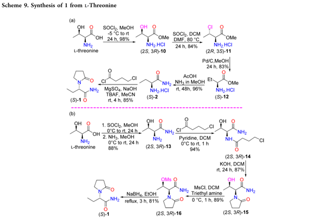 Shen和He以L-Threonine作为原料合成1。其中, L-Threonine中羧基经酯化、取代和Pd-C消除氯得到(S)-12;12经氨解为2,再与4-氯丁酰氯反应,以56%的总收率得到1(Scheme 9a)。另外一种,L-Threonine中羧基经酯化和氨解得到酰胺,在与4-氯丁酰氯反应生成3-羟基左乙拉西坦((2S,3R)-15);其羟基经甲磺酰化后,用NaBH4还原消除甲磺基,以59%的总收率得到1(Scheme 9b)。该路线中使用的亚硫酰氯和吡啶可能不适用于工艺放大。
