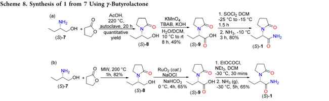 另外一方面,7 与 γ-丁内酯的混合物在高压釜中用乙酸处理或在微波反应器中于 200 °C 加热即可得到(S)-8。8再经高锰酸钾或 RuO₂/NaOCl 氧化生成酸(S)-9。(S)-9通过 SOCl₂ 制备酰氯或与烷基卤甲酸酯形成混合酸酐,随后氨解,分别以 39% 和 35% 的总收率得到 1(Sceheme 8a,b)。该路线步骤较多,且使用刺激性试剂 RuO₂ 和腐蚀性液体 SOCl₂,不利于实际应用。