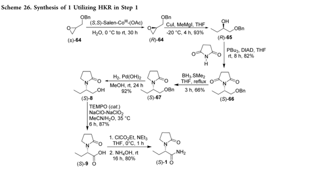 Muthukrishnan等利用HKR拆分外消旋苄基缩水甘油醚64,得对映体纯(R)-64;CuI/MgMeI区域选择性开环得(R)-65;Mitsunobu反应引入琥珀酰亚胺得(S)-66;部分还原构建2-吡咯烷酮得(S)-67;Pd(OH)₂氢解脱苄得(S)-8;TEMPO氧化得(S)-9;氯甲酸乙酯/氨解即得1(Scheme 26)。