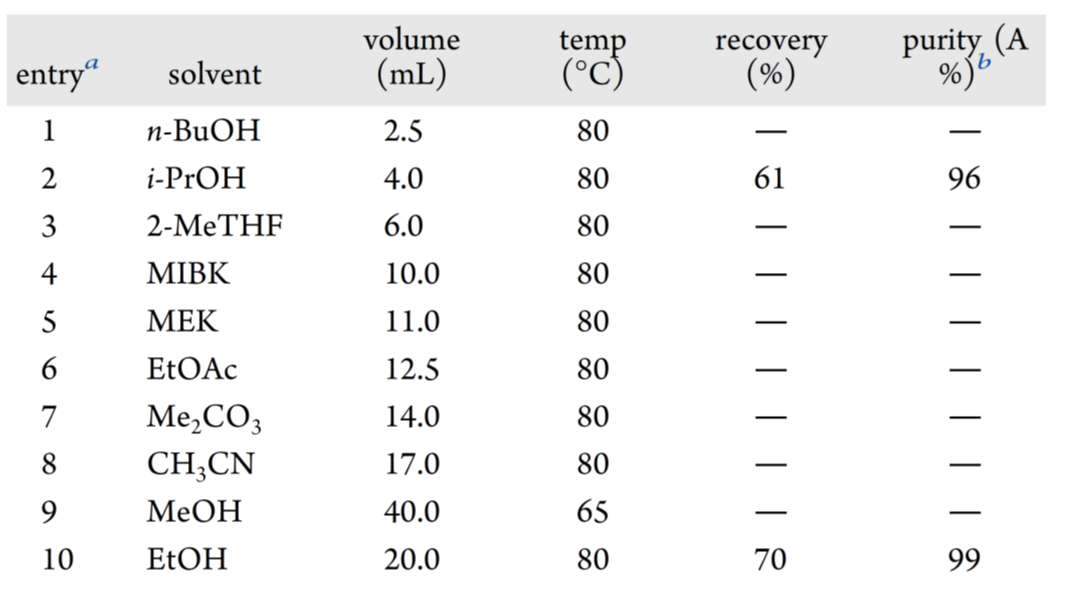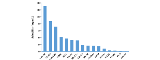钯去除后,浓缩物经 MeOH/DCM(5:1)研磨纯化,得灰白色 XJTU-L453,收率 85%,纯度 92%(HPLC A%)。二次研磨仅小幅提升纯度,故转向结晶工艺开发。基于室温 HPLC 溶解度测定(图6),筛选溶解度 5.0–20.0 mg/mL 的溶剂:n-BuOH(5 V)、2-MeTHF(12 V)几乎不析晶(表 9,entires 1、3);i-PrOH(8 V)得浅黄色晶体,回收率 61%,纯度 96%(entry 2)。 进一步考察溶解度 2.0–4.0 mg/mL 的溶剂,仅 EtOH(40 V)获得白色晶体,回收率 70%,纯度 99%(entry10)。