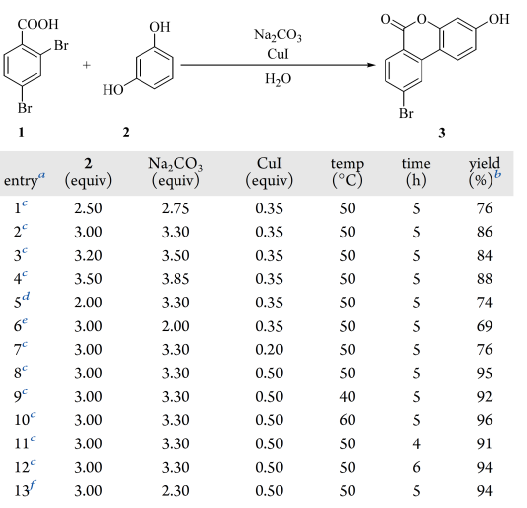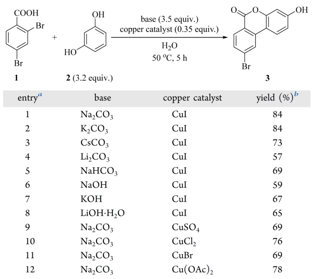 基于文献,CuI/Na₂CO₃ 体系显著可提升了 Hurtley 反应产率(目标物不同)。据此,系统筛选 2,4-二溴苯甲酸(1)与间苯二酚(2)的反应条件(表1)。CuI /Na₂CO₃ 组合给出最高产率(84%,表 1,entry 1);K₂CO₃ 效果相当(84%,entry 2)。其他碳酸盐(Cs₂CO₃、Li₂CO₃、NaHCO₃;entries 3–5)或强碱(NaOH、KOH、LiOH·H₂O;entries 6–8)均导致产率下降。因分子量更低、成本更优,优选 Na₂CO₃ 而非 K₂CO₃。在 Na₂CO₃ 条件下进一步筛选铜源,发现 CuSO₄、CuCl₂、CuBr 和 Cu(OAc)₂ 均不如 CuI(entries 9–12)。最终确定 CuI/Na₂CO₃ 为最优催化体系,与文献报道一致。