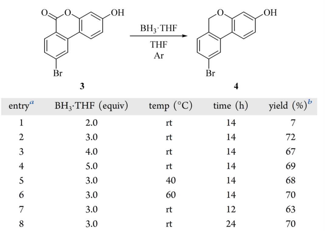 鉴于成本低、适用性广,作者选用 BH₃·THF 作为替代还原剂。相比苯基硅烷/GaBr₃ 体系,BH₃·THF 可高选择性地将 6H-苯并[c]色烯-6-酮(3)还原为 6H-苯并[c]色烯(4),副产物极少。当 BH₃·THF 用量低于 3.00 eq.时,产率显著下降(表 3,entries 1–2);增至 4.00 或 5.00 eq.未提升产率(entries 2–4);升温至 40 或 60 °C 亦无改善(entries 5–6);缩短至 12 h 导致转化不足,延长反应时间则产率持平(entries 7–8)。故选定entry 2 条件用于放大。BH₃·THF 的淬灭是关键安全步骤:因 BH₃ 高度活泼,淬灭不彻底可能在后续萃取或减压浓缩中突发氢气释放,引发严重风险。标准操作为:冰浴冷却反应液至 0–5 °C,缓慢滴加甲醇至无气体逸出,再进行后续处理。粗品经萃取、浓缩后可直接用于下一步反应——实验证实,本步杂质不影响下游转化效率;而纯化(浆洗或重结晶)不仅收率低(重结晶仅 48%,柱层析 73%)、纯度未达优(重结晶 98%,但颜色差),反而增加操作风险与损耗。