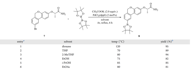基于第一代路线,PdCl₂(dppf) 降至 2 mol% 后,收率反升至 95%(表 5,entry 1),证实其充足性。溶剂筛选(表 5,entries 2–6)显示:2-MeTHF 94%收率,与二氧六环相当;THF 因沸点偏低收率下降;EtOH、i-PrOH 和 EtOAc 则因副反应增多导致收率降低。最终确立最优条件:丙酰胺(7)、B₂Pin₂(1.50 equiv)、KOAc(2.00 equiv)、PdCl₂(dppf)(2 mol%)在 2-MeTHF 中,Ar 气保护下 80 °C 反应 6 h。反应结束后,混合物经硅藻土垫过滤除杂;滤液萃取、减压浓缩得粗品;粗品悬浮于正庚烷中重浆,脱除残留 B₂Pin₂;10 g 规模下直接获得硼酸酯(8),94%收率, 94%纯度(HPLC A%)。