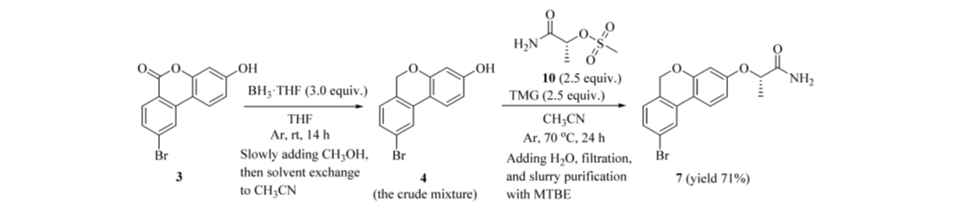 为规避中间体 6H-苯并[c]色烯(4)纯化收率低的问题,开发了从 6H-苯并[c]色烯-6-酮(3)至丙酰胺(7)的两步一锅串联工艺(图5):BH₃·THF 反应淬灭后,直接置换溶剂为 CH₃CN,不经分离,立即投入甲磺酸酯(10)进行取代。以 17.4 g 起始原料(3)计,丙酰胺(7)以 71% 总收率、98% HPLC 纯度(A%)、96.5:3.5 e.r. 直接获得,呈浅黄色粉末。相较原药物化学路线(3 → 4 → 7,三步,57% 总收率,含两次柱层析),该串联工艺减少一步操作,总收率提升 14 个百分点,并彻底避免柱层析。