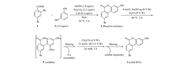 6H-苯并[c]色烯-6-酮 3 虽可通过过滤和水洗初步分离,但残留铜确难以清除。文献报道其内酯环在碱性条件下可逆开环溶于碱液,酸化后闭环析出。据此,开发了改进的后处理工艺(图 4):反应结束后,向悬浮液中加入 4 M NaOH(8 V/W)和水(20 V/W),使有机组分(除铜杂质外)全部溶解,滤除不溶铜渣;滤液含开环钠盐 3′,加入 CH₃CN(4 V/W)以增溶未反应的间苯二酚(2),避免其在酸化时共沉淀;随后快速加入 12 M HCl(5 V/W)闭环,定量再生 3,直接过滤、水洗即得高纯产物。该工艺应用于 20.0 g 2,4-二溴苯甲酸(1)与 23.6 g 间苯二酚(2)的 Hurtley 反应,以 85% 收率获得 3,HPLC 纯度 99%,铜残留仅 4 ppm。