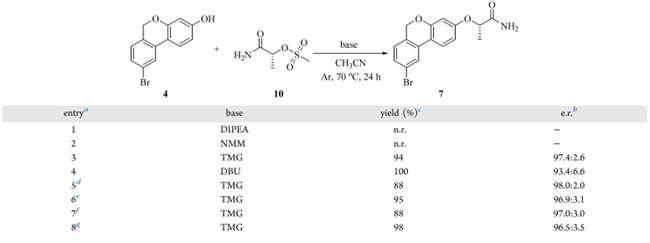 前人研究表明,(R)-1-氨基-1-氧代丙-2-基甲磺酸酯(10)与 TMG 在 CH₃CN 中可高效实现酚羟基的乳酰胺化,且消旋化程度极低。化合物 10 按“反应物合成”部分制备;随后在 CH₃CN 中考察其与 6H-苯并[c]色烯(4)的亲核取代反应(表 4)。筛选均相有机碱发现:NMM 和 DIPEA 因碱性不足,反应不发生(entries 1–2);TMG 给出 94% 收率和 97.4:2.6 e.r.,DBU 虽达 100% 收率,但 e.r. 降至 93.4:6.6(entries 3–4)。综合考量,TMG 为最优选择——兼顾高收率与优异对映体控制。 当量优化表明:10 eq. 低于 3.00 equiv(如 2.00 equiv)导致收率跌至 88%(entries 3、5–6);增至 3.00 equiv 无增益。TMG 用量减至 1.50 equiv 时收率亦为 88%,升至 2.50 equiv 则收率提升至 98%(entries 7–8);此时 e.r. 的轻微下降(<1%)可接受,因收率显著提高。