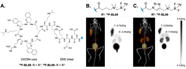 近期,研究发现,AMBF3与靶向肽之间的连接化学结构直接影响体内性能。在CXCR4靶向肽示踪剂的头对头比较中,不含三唑环、仅含酰胺键的18F-BL08(图1A)展现出更优的肿瘤/肾脏比值;而结构高度相似但含CuAAC衍生1,4-三唑键的18F-BL09(图1B)虽肿瘤摄取相近,肾脏滞留却高达7.5%ID/g。其中,18F-BL08的肾脏摄取较18F-BL09降低3.4倍,显著改善肿瘤/肾脏对比度,证实AMBF3-Abu-OK(1)这一酰胺型连接体对体内药代动力学具有关键调控作用。