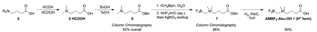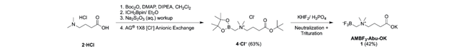 该路线存在(Scheme 1A)存在明显瓶颈:以GABA(5)为起始,经Eschweiler–Clarke甲基化和Fischer酯化得苄酯(6),两步转化均不完全,且叔胺6的柱层析纯化繁琐(收率仅52%);后续涉及保护基切换、AgNO₃/Pd催化、以及使用强腐蚀性TFA和剧毒KHF₂构建BF₃基团,操作危险、步骤冗长;更关键的是,中间体7在硅胶柱上极易脱氟分解,必须极速过柱,导致批次间脱保护效率波动大、产物交付不可控,单批产量长期受限于<500 mg(图2)。