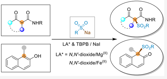 砜类化合物是药物和生物活性分子中重要的优势结构骨架。尽管通过磺酰阴离子或自由基构建C(sp3)–SO2键的研究已取得进展,但对映选择性控制仍然是一个巨大挑战。本文通过利用手性双氮氧配体-Mg(II)或-Fe(II)络合物在TBPB/NaI氧化体系下,不仅实现了β-酮酰胺的高效不对称α-磺酰化,而且首次在温和条件下实现了2-萘酚的去芳基磺酰化。