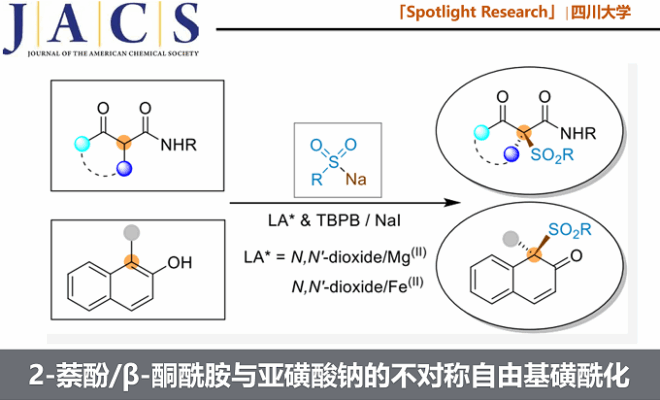 2025年11月27日,J. Am. Chem. Soc.在线发表了来自四川大学冯小明院士/刘小华教授团队题为「Enantioselective Radical Sulfonylation of 2-Naphthols and β-Ketoamides with Sodium Sulfinates」的研究论文。该文报道了一种新型不对称自由基α-磺酰化策略,该策略采用TBPB/NaI氧化体系,并由手性双氮氧配体-镁(II)或-铁(II)配合物催化。该方法首次在温和条件下实现了β-酮酰胺的高效不对称α-磺酰化,以及2-萘酚与磺酸钠的去芳构化磺酰化反应,以良好收率和优异对映选择性获得手性α-磺酰基羰基化合物,且底物适用范围广泛。该工作为实现自由基磺酰化反应的对映选择性控制提供了新方法。