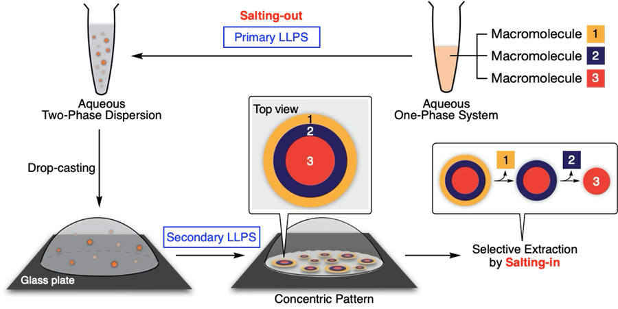图2:通过双重液-液相分离(DLLPS)对近乎相同的水溶性大分子进行同心圆状分离的概念与过程示意图。