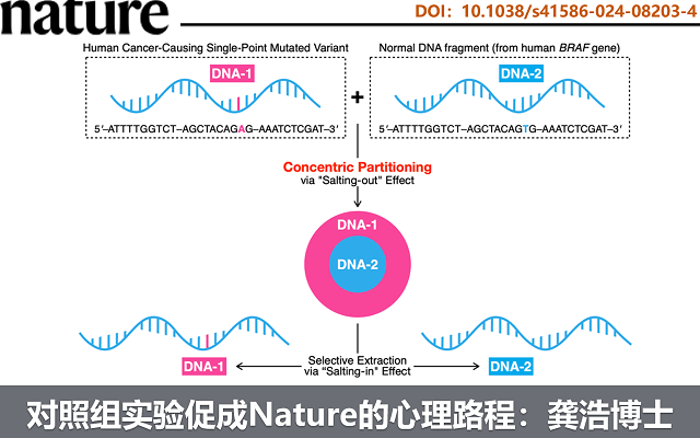 最初,我在研究聚乙二醇(PEGs)和蛋白质时发现了这一分离现象,随后扩展到核酸(如DNA和RNA)的分离。通过PEGs作为模型分子,构建了同心分离的机制,而在应用部分,实现了近乎相同DNA的纯化,即,这一发现实现了从其与原始DNA的1:1混合物中分离出来的纯度达97%的对人类致癌单核苷酸变体的选择性分离。