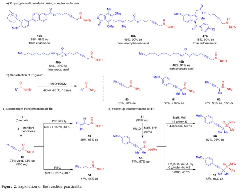紧接着,作者对反应的实用性进行了研究(Figure 2)。首先,该策略可用于一些复杂分子的后期衍生化,如阿达帕林、霉酚酸、吲哚美辛、芥酸和亚油酸,获得相应的产物45b–49b,收率为35-58%,ee为89-91%。其次,在MsOH/DCM条件下,可将上述产物中的Tr基团进行脱除,获得胺类化合物50–52,收率为56-78%,ee为90->99%。同时,化合物51可与新戊酸酐反应,样可以74%的收率得到N-Piv保护的化合物55,ee为97%。化合物55在NaH/MeI条件下进行烷基化反应,可以82%的收率得到产物56,ee为96%。化合物55在Ph2IOTf/Cu(OTf)2条件下进行芳基化反应,可以52%的收率得到产物57,ee为96%。此外,克级规模实验,同样可以76%的收率得到产物1b,ee为93%。化合物1b在Pd/CaCO3条件下进行半氢化反应,可以59%的收率得到顺式烯烃53,ee为93%。化合物1b在Pd/C条件下进行氢化反应,可以57%的收率得到烷基亚磺酰胺54,ee为94%。