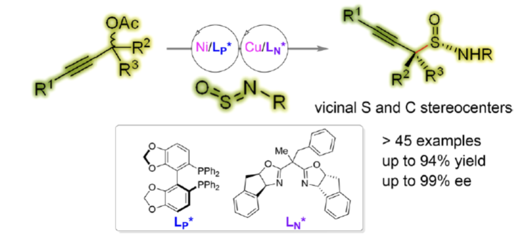 近日,南京大学的史壮志课题组在J. Am. Chem. Soc.中发表论文,提出了一种突破性的策略,通过外消旋炔丙酯与sulfinylamines的不对称加成反应,高效合成了兼具硫(IV)手性生成中心与炔基结构单元的S-炔丙基亚磺酰胺类化合物。该创新方法利用镍/铜双金属协同催化体系,其中每种金属中心分别与不同的手性配体配位。该体系展现出对硫手性中心不可比拟的控制能力,可兼容一级与三级炔丙基酯类底物。值得注意的是,在二级炔丙基酯类底物参与的反应中,碳立体中心与硫立体中心均实现了优异的对映选择性与非对映选择性。综合机理研究揭示了镍与铜催化在实现高度立体选择性控制中的独特互补作用,为复杂不对称合成催化体系的设计提供了新见解。