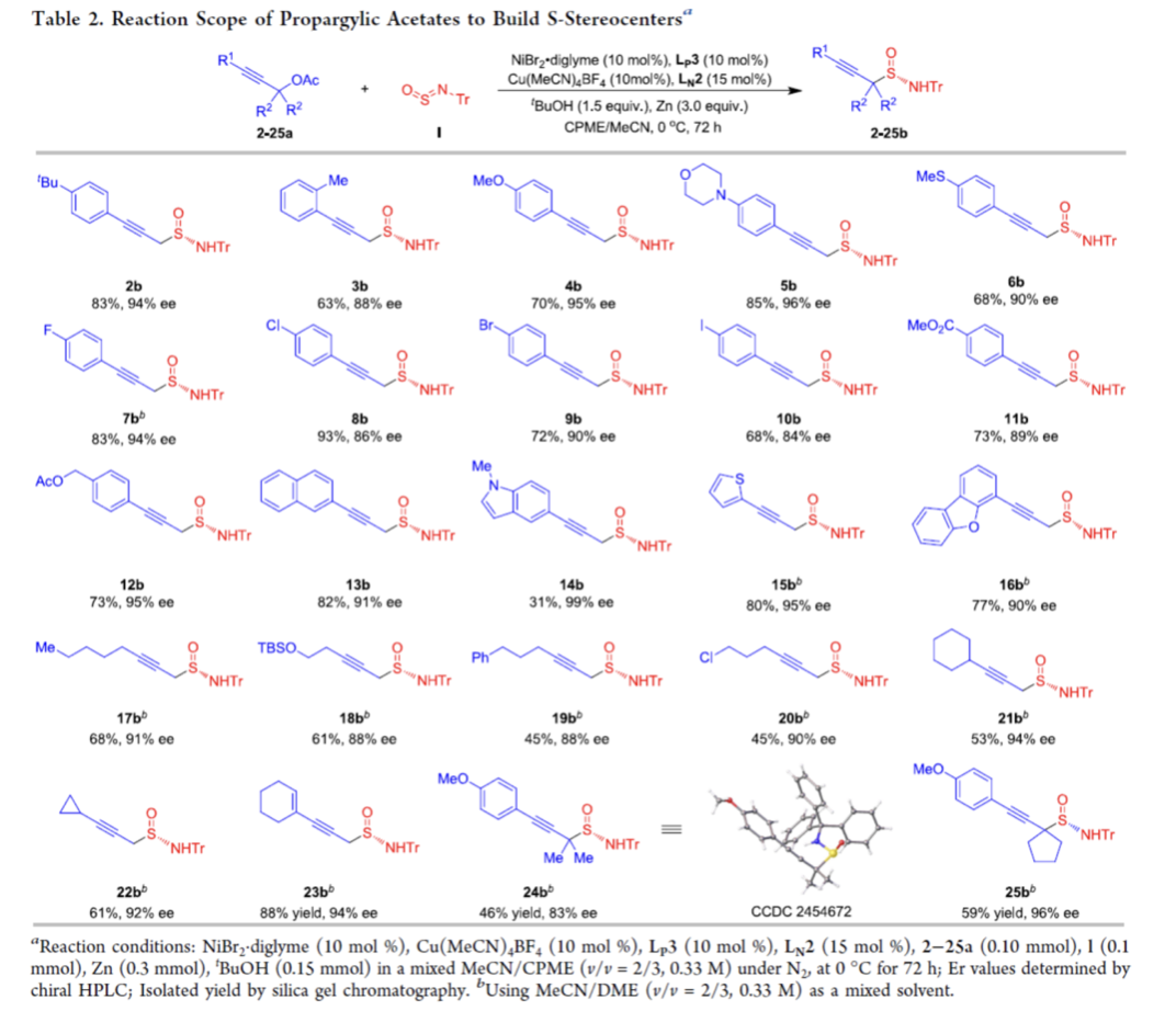 在上述的最佳反应条件下,作者对构建硫立体中心的炔丙基酯的底物范围进行了扩展(Table 2)。首先,当炔丙基酯底物中的R1为不同电性取代的芳基、萘基以及杂环芳烃等时,均可顺利进行反应,获得相应的产物2b–16b,收率为31-93%,ee为86-99%。其次,当炔丙基酯底物中的R1为各种烷基与环烷基时,也能够顺利进行反应,获得相应的产物17b–23b,收率为45-88%,ee为88-94%。此外,更具挑战性的三级炔丙基酯衍生物,也是合适的底物,分别获得相应的产物24b(收率为46%,ee为83%)和25b(收率为59%,ee为96%)。