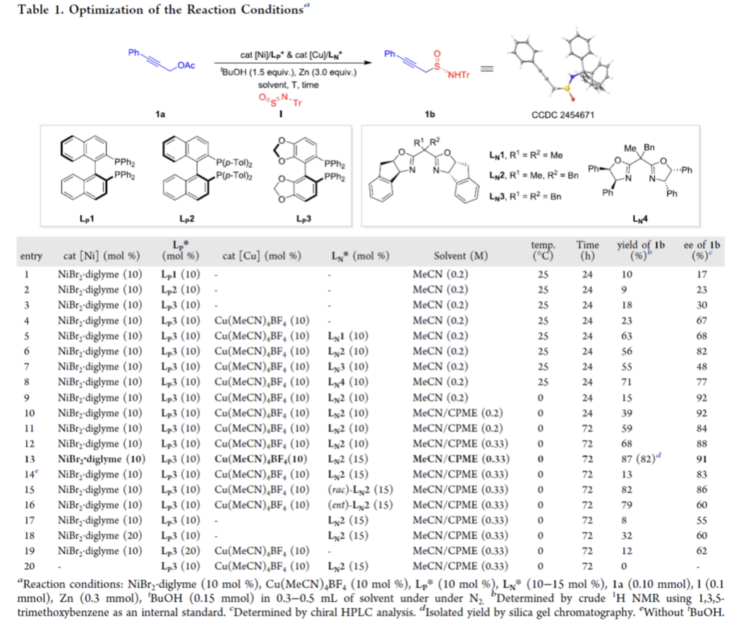 首先,作者采用一级炔丙基酯衍生物1a与sulfinylamine I作为模型底物,进行相关反应条件的优化筛选 (Table 1)。进而确定最佳的反应条件为:采用NiBr2·diglyme与LP3作为镍催化体系,Cu(MeCN)4BF4与LN2作为铜催化体系,tBuOH作为添加剂,Zn粉作为还原剂,在MeCN/CPME反应溶剂中,反应温度为0 oC,最终获得82%分离收率的产物1b(91% ee)。