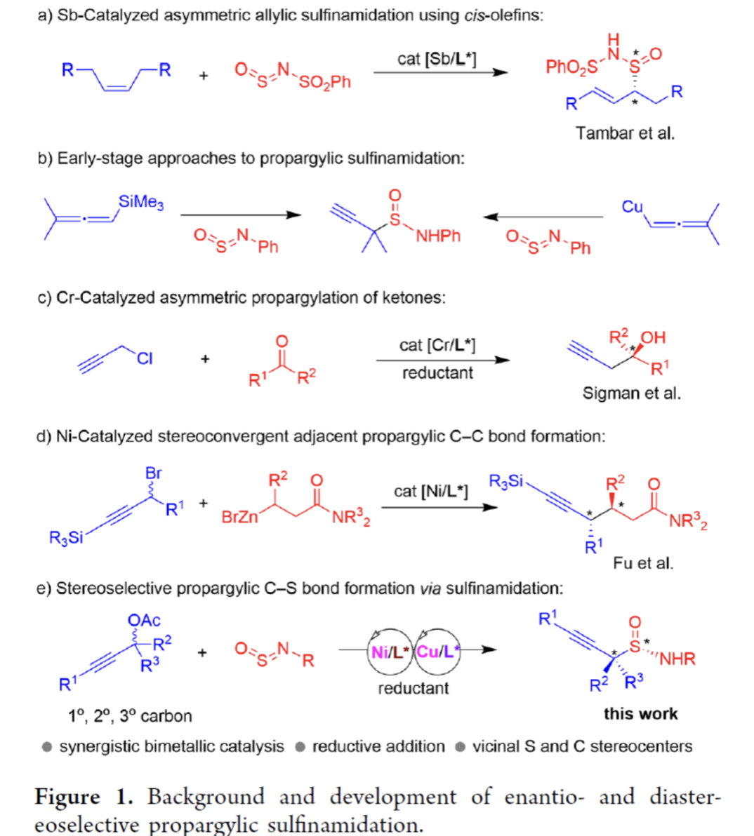 具有立体硫(IV)手性中心的手性亚磺酰胺,近年来因在制药、农用化学品、手性助剂、配体设计与有机催化等领域的广泛应用而受到显著关注。它们不仅是立体选择性构建含硫官能团的关键中间体,同时在温和的光氧化还原催化条件下可作为多功能双效试剂。最近,在合成亚磺酰胺的不对称催化领域取得了重大突破,特别是通过加成反应高效制备芳基与乙烯基亚磺酰胺衍生物[1]。2017年,Tambar团队开发一种Sb-催化顺式烯烃的不对称烯型sulfinamidation反应[2],实现了allylsulfinamides的对映及非对映选择性控制(Figure 1a),标志着该领域的重要里程碑。然而,N-磺酰基亚磺酰胺基团常作为离去基团存在,其在硫立体中心构建中的潜力仍未充分开发。同时,炔基作为有机合成的关键官能团,可驱动多样化的下游转化。因此,鉴于S-炔丙基亚磺酰胺的结构复杂性与潜在应用价值,其合成方法长期以来一直是合成化学的研究重点。早期的合成策略依赖于allenylsilanes与sulfinylamines的烯反应实现构建[3](Figure 1b)。随后,化学家们发展的更具普适性的方法,如allenylcopper对sulfinylamines的亲核加成,显著扩大了合成策略的范围。然而,此类化合物的立体选择性合成仍存在诸多挑战。