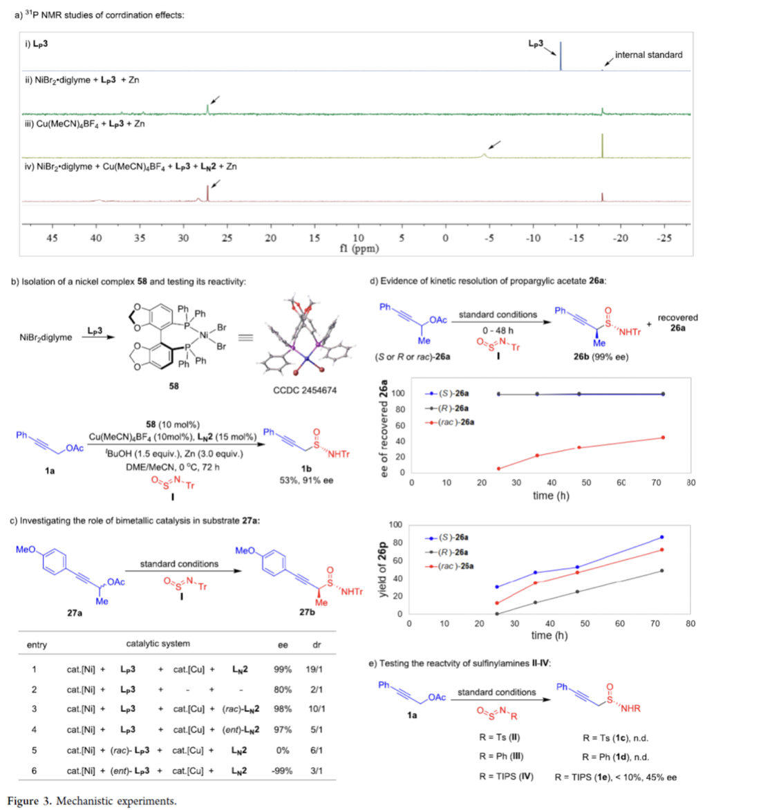 接下来,作者对反应的机理进行了研究(Figure 3)。首先,通过31P NMR对双金属体系内的配位相互作用研究结果表明,膦配体LP3仅与镍催化剂配位,而LN2则与铜盐相互作用(Figure 3a)。当化学计量的配体LP3与NiBr2·diglyme结合时,形成了镍配合物58,其具有催化活性,进一步证明了膦配体LP3与镍催化剂存在配位(Figure 3b)。其次,通过双金属体系对二级炔丙基酯底物27a的控制实验结果表明,具有匹配构型的LP3与LN2组合能同时实现高水平的对映选择性和非对映选择性(Figure 3c)。(R)-/(S)-/外消旋-26a与I的反应结果表明,双金属体系的立体选择性主要由手性配体决定。同时,氧化加成步骤是不可逆的。并且,26a的两种对映体显示出不同的反应速率,表明了反应存在动力学拆分的过程(Figure 3d)。此外,通过不同N-取代sulfinylamines对于反应的影响研究表明,选择I更有利于同时实现高反应活性和高立体选择性(Figure 3e)。