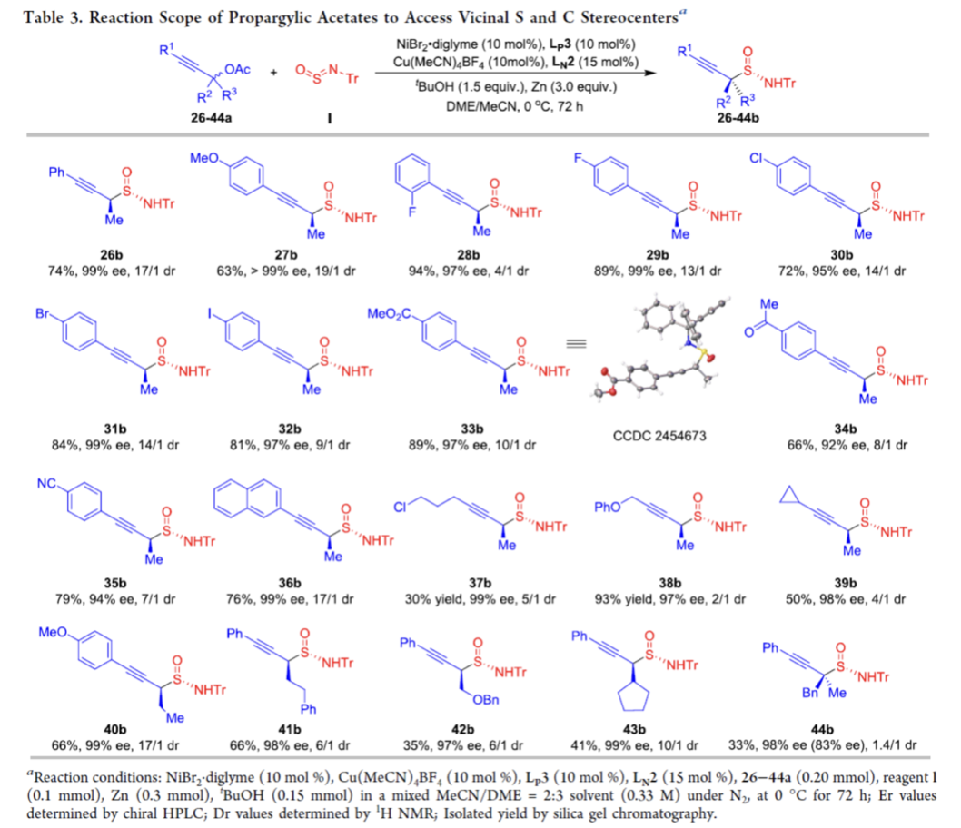其次,作者对构建相邻硫与碳立体中心的炔丙基酯的底物范围进行了扩展(Table 3)。首先,当二级炔丙基酯底物中的R1为不同电性取代的芳基与萘基时,均可顺利进行反应,获得相应的产物26b–36b,收率为63-94%,ee为92->99%,dr为4:1-19:1。其中,当二级炔丙基酯底物中含有邻位取代的芳基,反应的非对映选择性偏低,如28b。其次,当二级炔丙基酯底物中的R1为烷基与环丙基时,也能够顺利进行反应,获得相应的产物37b–39b,收率为30-93%,ee为97-99%,dr为2:1-5:1。此外,当二级炔丙基酯底物中的R2或R3为乙基、苯基丙基、苄基醚以及环戊基时,也与体系兼容,获得相应的产物40b–43b,收率为35-66%,ee为97-99%,dr为6:1-17:1。同时,当炔丙基酯底物中的R2或R3分别为甲基与苄基时,可以33%的收率得到产物44b,ee分别为83%和98%,dr为1.4:1。