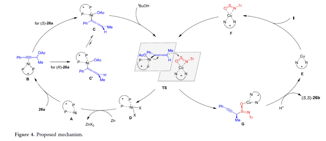 基于上述的实验研究,作者提出如下合理的反应机理(Figure 4)。首先,镍配合物A与(S)-26a的优先配位。该配位配合物B经历不可逆的SN2′-型anti-氧化加成,从而形成η1-联烯基镍配合物C。与此同时,(R)-26a也可与镍配合物A配位,并经氧化加成形成配合物C’,其可发生差向异构化生成配合物C,但此过程的具体机制尚不明确。推测的中间体可能包括:炔丙基阳离子、炔丙基双核配合物或η³-联烯基中间体。(R)-26a的反应速率慢于(S)-26a,这归因于底物与手性口袋构型更匹配,该现象与上述实验观测结果一致。在平行的铜催化循环中,铜配合物E与sulfinylamine I配位,增强硫中心的亲电性,形成配合物F。随后,η1-联烯基镍配合物C经过渡态TS从其Si-面进攻该物种,形成铜配合物G和镍配合物D。值得注意的是,一种涉及η¹-联烯基镍中间体C通过Zimmerman-Traxler-型过渡态加成到S=N键的替代路径可被明确排除。该路径将导致顺式加成产物的形成,这与实验观测的立体化学结果不符。随后,中间体G经质子化后,主要生成(S,S)-26b立体异构体。最后,高价镍配合物D被锌粉逐步还原,从而再生镍配合物A并完成催化循环。