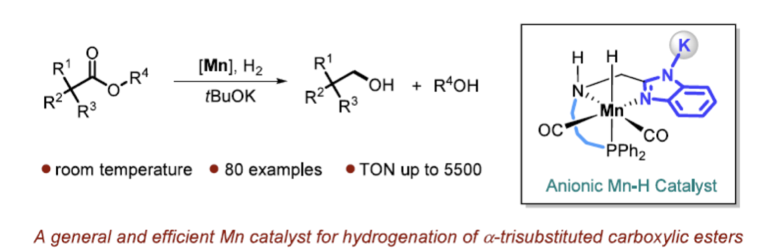 清华大学的刘强等课题组设计并合成了一类新型的NNP-钳形锰氢化催化剂。与传统的中性金属氢化物催化剂不同,这些锰配合物在与叔丁醇钾和氢气反应时,会转化为具有钾抗衡阳离子的阴离子型Mn−H中间体。该钾抗衡阳离子通过以下双重机理显著提升了催化性能:首先,其可大幅增强酯底物羰基的亲电性,从而实现底物的高效活化;其次,该阳离子通过与醇盐基团的配位作用稳定了氢气异裂的过渡态。这种阳离子效应同时优化了氢转移和氢气异裂两个关键步骤,使该阴离子型Mn−H催化剂的性能显著优于对应的中性Mn−H催化剂。实验结果表明,该阴离子催化剂展现出优异的催化活性,在室温条件下即可高效实现具有空间位阻的α-三取代羧酸酯的氢化反应。
