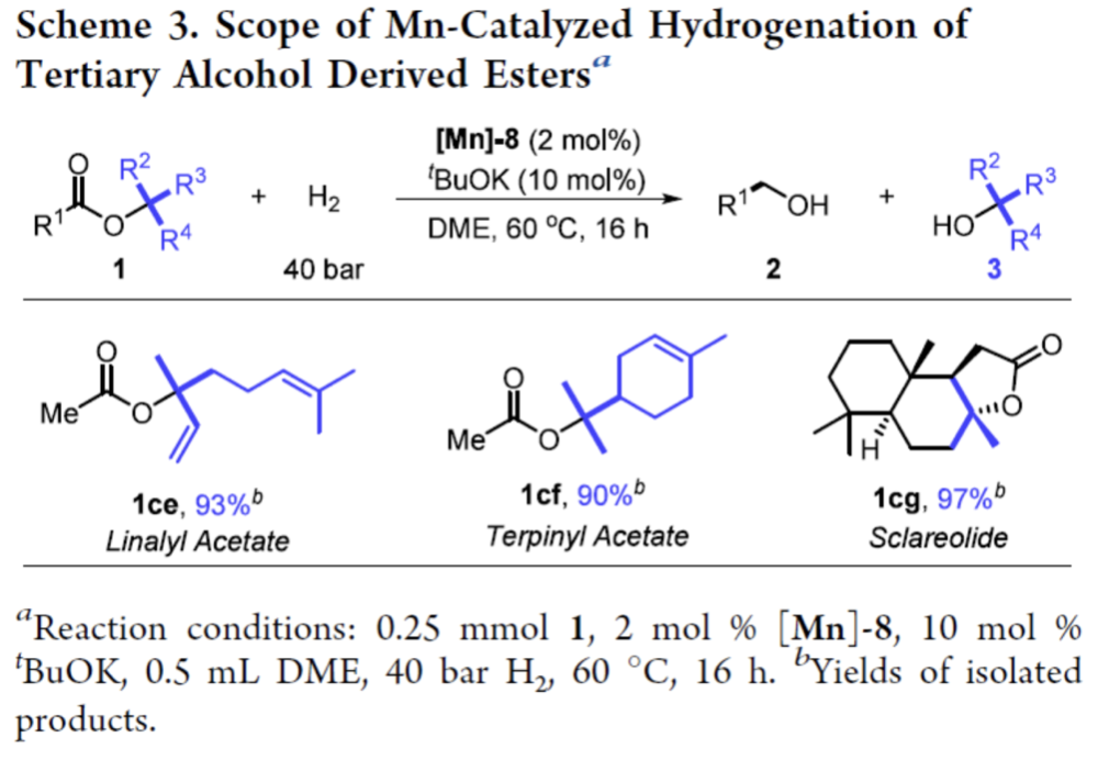 接下来,作者对三级醇衍生酯的底物范围进行了扩展 (Scheme 3)。研究表明,乙酸芳樟酯(1ce)和乙酸松油酯(1cf)经氢化可转化为相应的醇类化合物,收率为90-93%。香紫苏内酯(1cg)通过氢化也以97%的收率得到Ambradiol产物(3cg),其是合成降龙涎香醚的重要中间体。