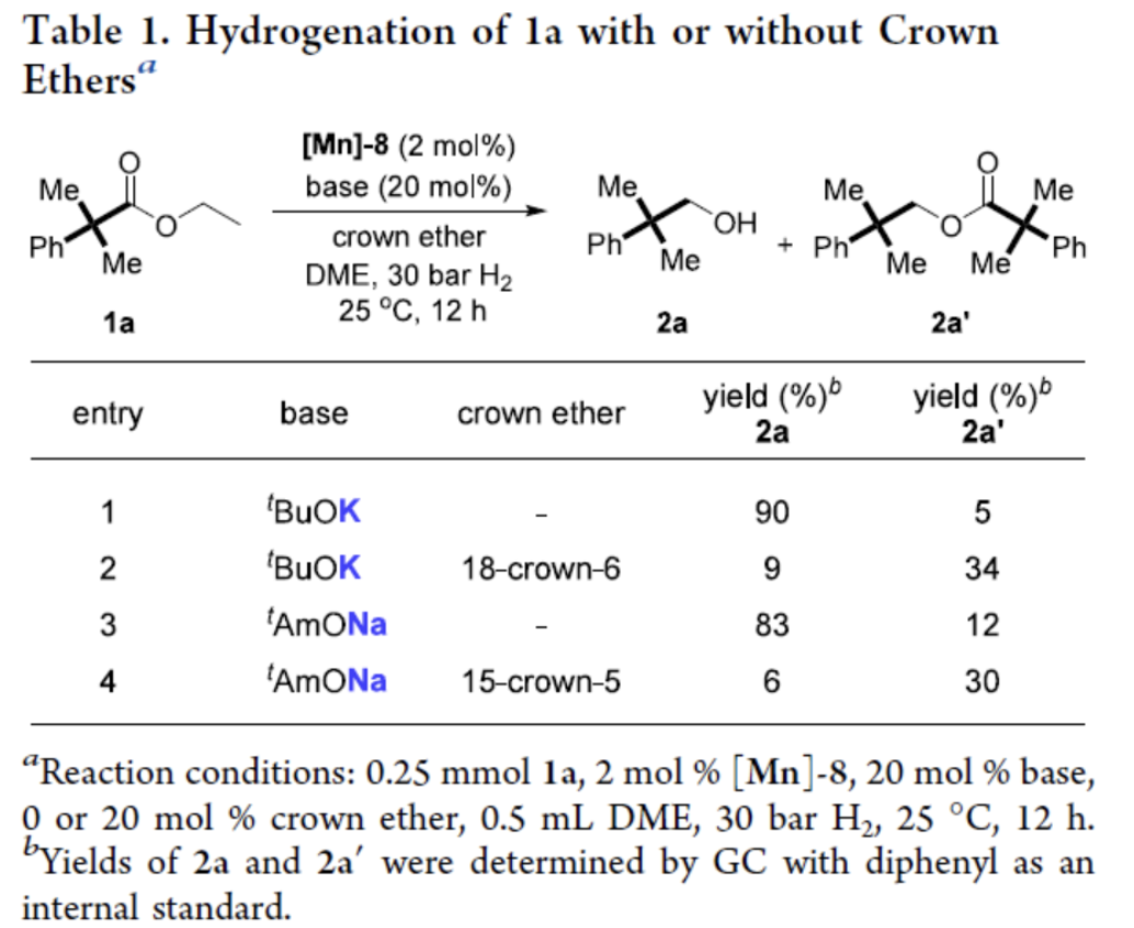 为探究反离子在[Mn]-8催化酯氢化反应中的作用,作者进行了添加冠醚与不添加冠醚的对照实验(Table 1)。研究结果表明,钾或钠阳离子在稳定关键过渡态及反应中间体中的核心作用,这对实现大位阻α-三取代羧酸酯高效氢化所需的高催化活性至关重要。