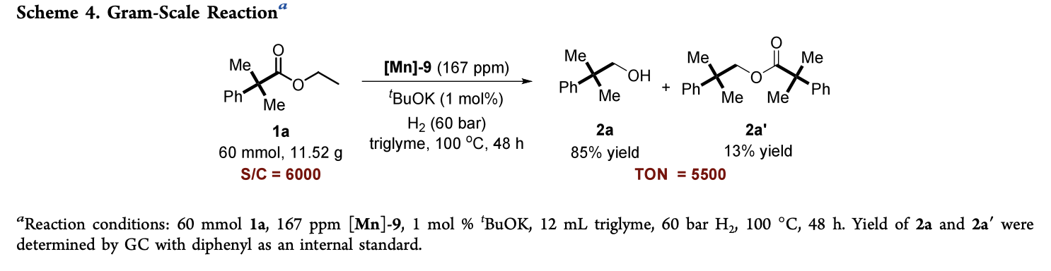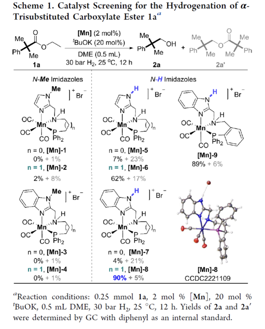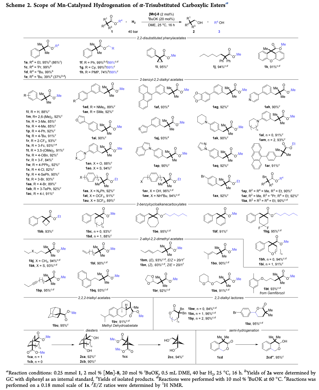 首先,作者采用2,2-二甲基苯乙酸乙酯1a作为模型底物,进行相关反应氢化反应条件的优化筛选(Scheme 1)。进而确定最佳的反应条件为:采用[Mn]-8作为催化剂,tBuOK作为碱,DME作为溶剂,在30 bar的氢气氛围中25 oC反应,最终获得90%收率的2-甲基-2-苯基丙-2-醇产物2a。其中,含有N–Me基团的锰催化剂([Mn]-1−4)在底物1a的氢化反应中表现出极低活性。相比之下,在相同条件下,将侧链中的N–Me基团替换为N–H基团([Mn]-5−9)时,显著提高了反应效率。