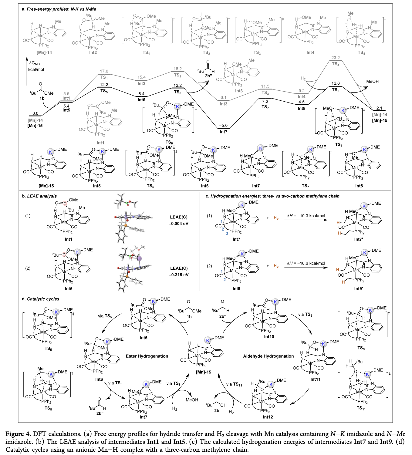 为了进一步研究阳离子对催化剂反应性的影响,作者还进行了DFT计算,以阐明锰催化酯的加氢机理(Figures 4a-4c)。首先,[Mn]-15和[Mn]-14通过过渡态TS5和TS1向底物1b进行氢转移,生成半缩醛键合中间体Int6和Int2。针对LEAE分析表明,中间体Int5中羰基碳原子的LEAE显著低于Int1,这表明钾阳离子通过与羰基的配位作用增强底物的亲电性。甲醇-锰中间体Int7和Int3形成后,通过过渡态TS8和TS4发生醇盐辅助的H2异裂过程作为决速步骤,从而再生Mn-H配合物[Mn]-15和[Mn]-14。这些结果表明,阴离子型Mn−H配合物中的钾离子通过稳定含氧中间体和过渡态,促进了氢化反应进程。