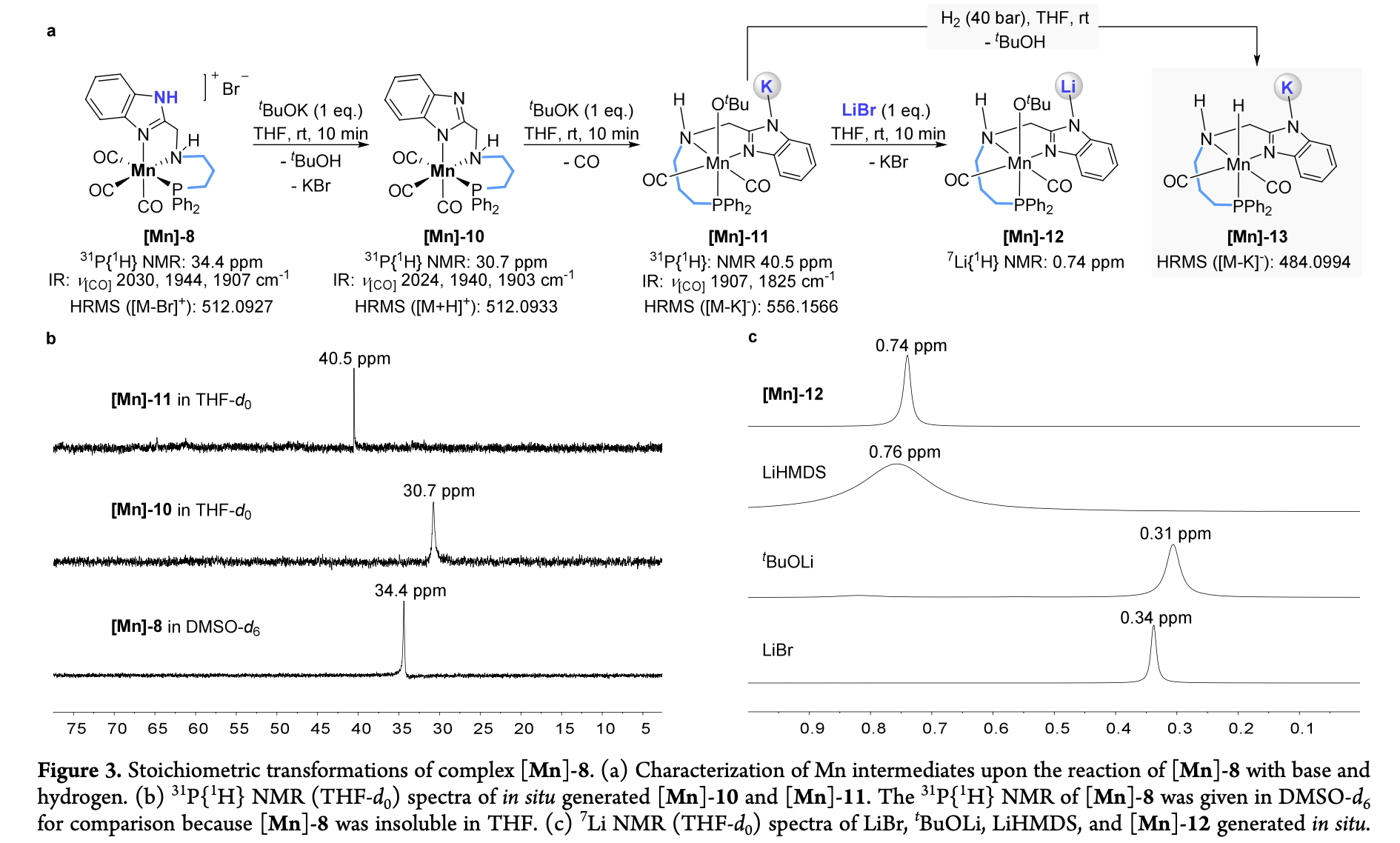 为了阐明[Mn]-8高催化活性的起源,作者还进行了一系列机理研究(Figure 3)。首先,[Mn]-8与tBuOK的化学计量反应,可生成氨基-锰配合物。基于苯并咪唑的N-H基团相较于中心脂肪族二级胺具有更强的酸性,这一中间体被推测为[Mn]-10。同时,所有三个CO配体都保留在[Mn]-10中,如2024、1940和1903 cm-1处的新红外吸收带所示,与[Mn]-8中的吸收带(2030、1944和1907 cm-1)相比,这些吸收带发生了红移,这表明[Mn]-10中的金属中心比[Mn]-8更具富电子性,这与从阳离子型锰配合物([Mn]-8)到中性锰配合物([Mn]-10)的转变特征相符。其次,[Mn]-10进一步与一当量的tBuOK反应,导致脱去一个CO配体并即刻生成新配合物[Mn]-11(Figure 3b)。此外,为了研究是否形成了阴离子型锰(Mn-ate)配合物,向[Mn]-11中加入一当量LiBr。该反应迅速生成[Mn]-12,其中[Mn]-11中的K+被Li+置换,并通过7Li NMR确证了Mn-ate配合物中的阳离子种类(Figure 3c)。进一步对[Mn]-12的7Li NMR化学位移表明,[Mn]-11或[Mn]-12中的阳离子(K+或Li+)与氮原子配位。随后,[Mn]-11与H2反应,得到具有催化活性的阴离子Mn-H配合物[Mn]-13。同时,阴离子Mn-H配合物[Mn]-13可在催化反应中形成,并作为后续氢转移步骤的高活性中间体。