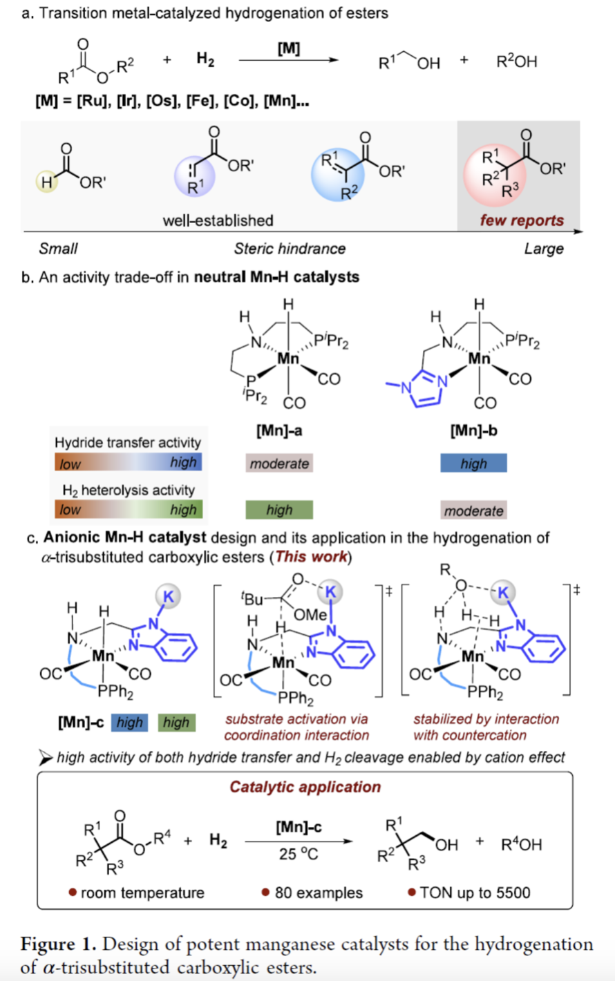 酯类化合物的催化氢化是有机合成中生成醇的一项基础且环境友好的反应,在大宗平台化学品和精细化学品的工业生产中具有关键作用。在过去的几十年里,已经成功设计出多种过渡金属催化酯类化合物的氢化反应[1]。然而,对于空间位阻较大的α-三取代羧酸酯氢化生成β-三取代一级醇的反应,仍面临巨大挑战(Figure 1a)。其中,提升催化剂的氢化活性是实现这一挑战性反应的关键。从反应机理上看,酯的氢化反应涉及两个关键步骤:1)通过H2异裂形成金属氢化物(M–H);2)氢化物从M–H物种向底物的转移。然而,这两个步骤对中心金属的电子特性往往存在矛盾要求。具体而言,促进氢化物转移的条件可能抑制H2异裂,反之亦然。例如,基于1-甲基咪唑的NNP钳形Mn–H催化剂[Mn]-b相较于PNP钳形类似物[Mn]-a表现出更高的氢化物转移活性,但NNP钳形Mn催化剂更难实现H2的异裂(Figure 1b)。基于这一发现,并结合锰催化氢化反应的机理研究[2],刘强等课题组假设:形成带有碱金属抗衡阳离子的阴离子型Mn–H中间体可能解决这一难题。这里,清华大学的刘强等课题组设计一类新型NNP钳形Mn配合物,其配体结构中包含N–H咪唑基团和三碳亚甲基链。在催化条件下,这类配合物可转化为具有钾抗衡阳离子的高活性阴离子型Mn–H配合物([Mn]-c)(Figure 1c)。进一步的研究表明,该催化剂对α-三取代羧酸酯的氢化表现出超高活性,成功实现此类空间位阻底物向β-三取代一级醇的高效转化。机理研究表明,在氢活化过程中,阴离子型Mn–H中间体中的钾抗衡阳离子与底物的羰基及烷氧基产生协同作用,可同步降低氢化物转移与H2异裂步骤的能障。