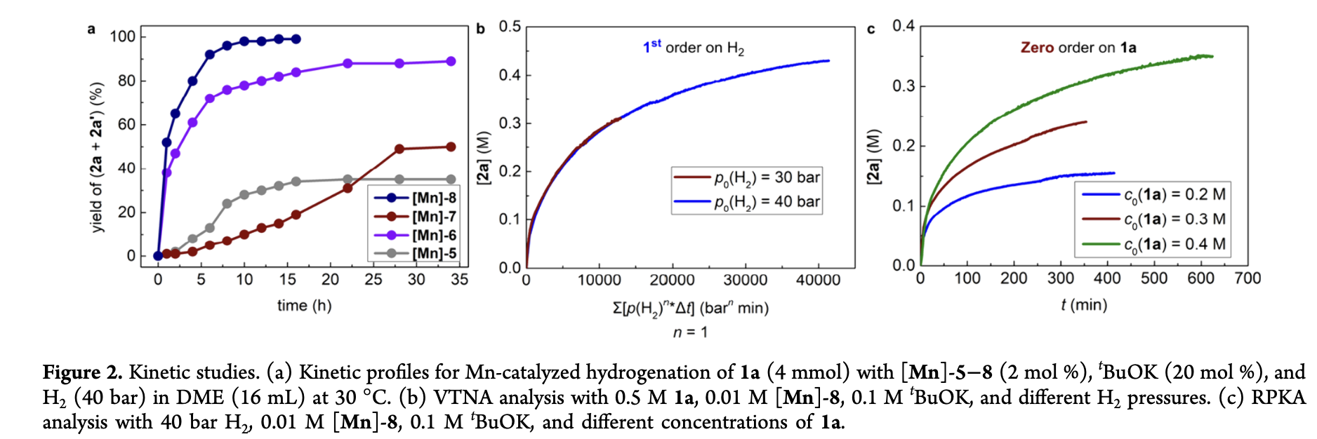 其次,作者对反应的过程进行了动力学研究 (Figure 2)。研究结果表明,在底物1a的氢化反应中,H2异裂(而非氢化物转移)是反应的决速步骤。
