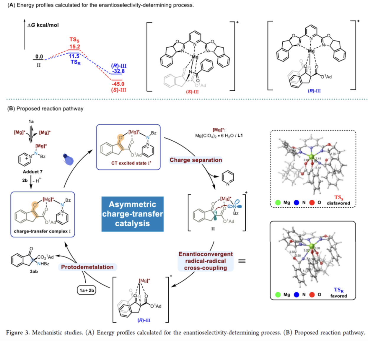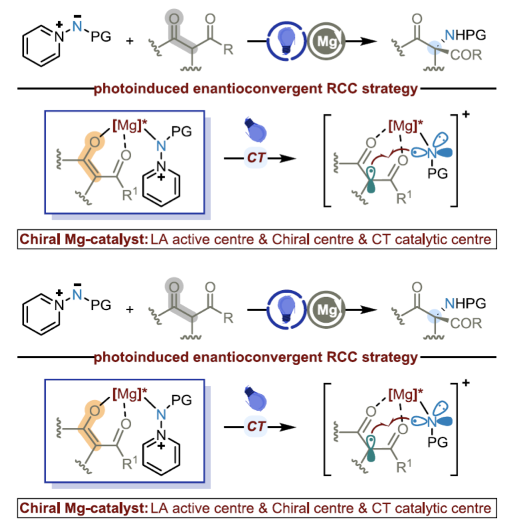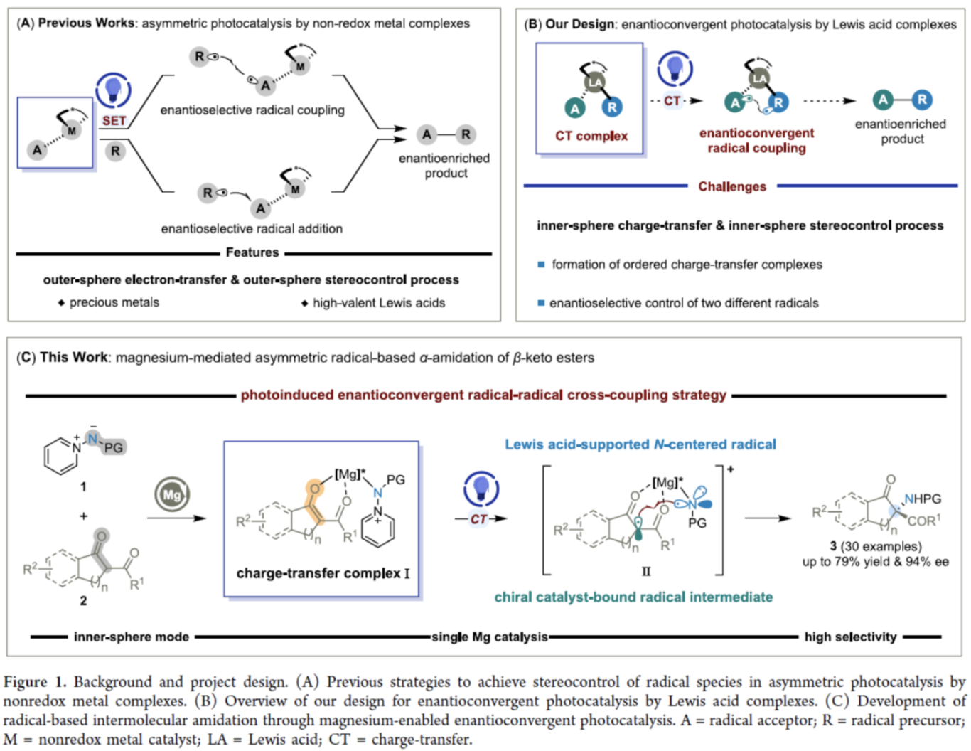 兰州大学的许鹏飞课题组开发了一种新型镁介导的电荷转移光催化体系,实现了此前难以实现的β-酮酸酯自由基不对称α-酰胺化反应。通过控制实验和计算研究的结合,证明了该策略的关键在于手性Lewis酸镁催化剂与iminopyridinium叶立德和烯醇盐的顺序配位。这种配位使镁配合物既可以作为手性的唯一来源,也可以作为电荷转移催化和Lewis酸活性中心,提供了一种双重配位策略,以解决非氧化还原金属催化自由基偶联反应(RCC)中长期存在的交叉选择性与对映选择性控制难题。